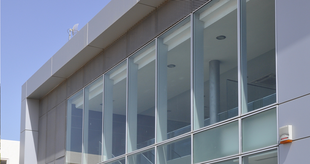 Le mur-rideau à cadre V.E.P, Vitrage Extérieur Parclosé, donne une vision extérieure de cadre aluminium et un joint creux de 20 mm entre les éléments.